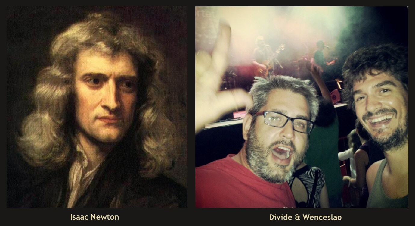 Para la segunda actuación tenemos un homenaje al gran Isaac Newton por el grupo Divide&Wenceslao. Con este proyecto musical, los físicos Màrius Belles y Eixarc Escaramís, derrochan ironía, inteligencia y descaro. Afirman que se han propuesto empeorar el mundo, que visto cómo están las cosas, es la manera de jugar una carta segura.