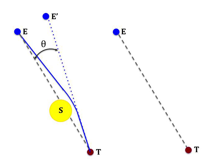 La presencia del Sol curva el haz de luz y las estrellas se ven en una posición aparente E'