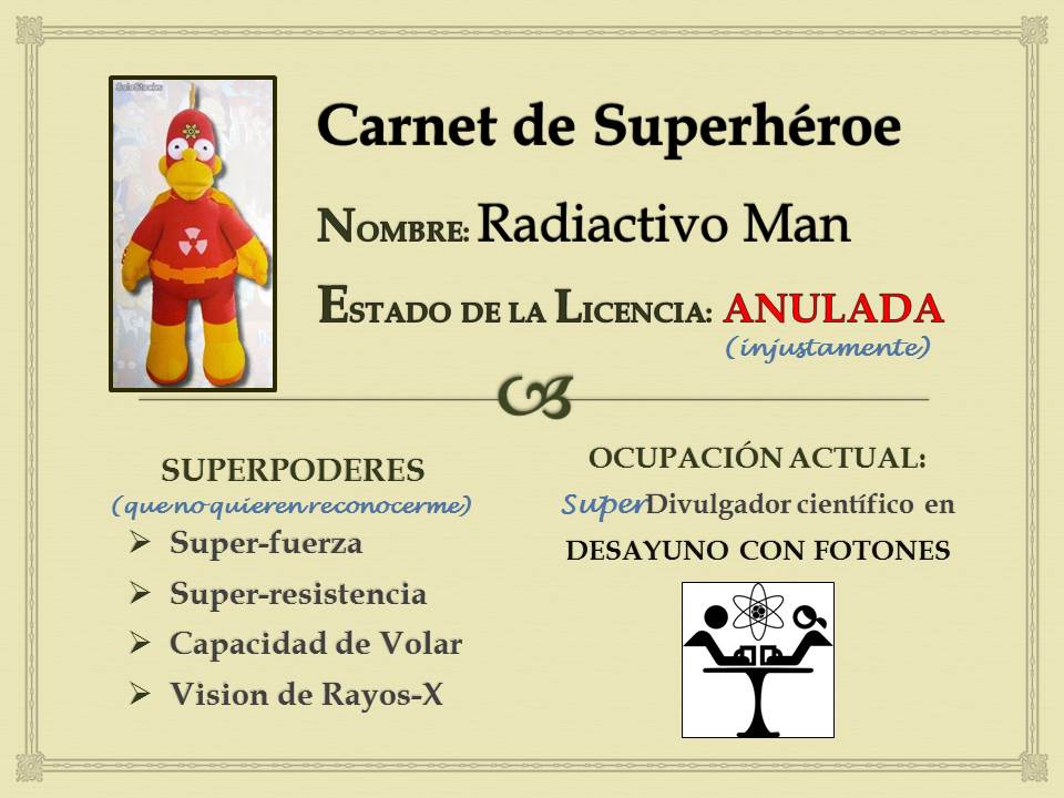 RADIACTIVO MAN: Una inspectora me quitó la licencia de superhéroe porque me tenía manía pero le aseguro que soy un monstruo divulgando, además me he hecho el carné. Así que, si me permite, tengo aquí a unos lectores impacientes por escuchar mis palabras.