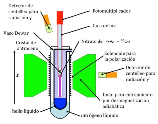El método ideado consistió en depositar una capa muy fina de cobalto, de unas 60 micras, en la superficie de un cristal de nitrato de cerio y magnesio. Mediante evaporación a baja presión de helio líquido y desmagnetización adiabática con un campo de 2.3 T se consiguió llegar a 0,003 K. A continuación, se alinearon los núcleos de cobalto hacia arriba o hacia abajo haciendo circular corriente, en uno u otro sentido, por un solenoide coaxial con el dispositivo. La radiación gamma que también se emite en la desintegración, se empleó para controlar la dirección de polarización de los átomos de Co-60 y su uniformidad en la muestra.