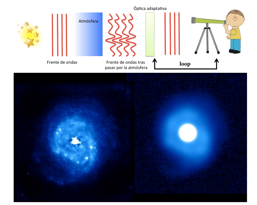 Lo primero que tenemos que tener claro es el problema al que se enfrentan los telescopios terrestres. La luz emitida por una estrella al pasar por la atmosfera terrestre se “deforma” produciendo una imagen menos nítida en el telescopio de la que debería. En términos técnicos, la atmosfera produce una deformación del frente de ondas, definiéndose el frente de ondas como el conjunto de puntos de un medio que son alcanzados en el mismo instante por una onda.