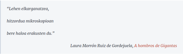 La mañana despertó leyendo esta preciosa entrevista que me hizo Azucena Martín en Hipertextual y siguió con este regalazo: ver un magnífico artículo de Juan Ignacio Pérez introducido por uno de mis scikus en tres blogs de la Cátedra de Cultura Científica de la UPV/EHU: el Cuaderno de Cultura Científica, Mujeres con Ciencia y Zientzia Kaiera. En este último, además, ¡traducido al euskara!